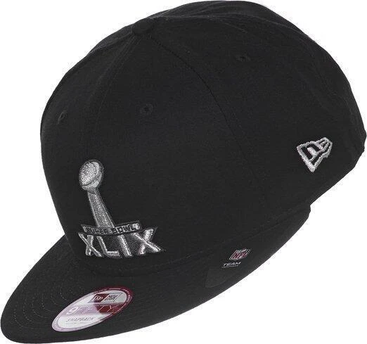 100% katoenen snapback met contrasterend vizier met Superbowl XLIX-logo middenvoor geborduurd en New Era-vlag bij het vizier links van de drager.